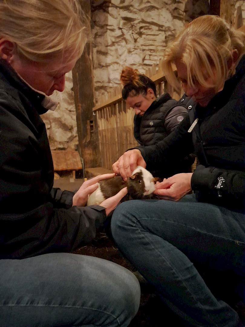 Am zweiten Kurstag besteht die Möglichkeit bei Kooperationspartnern an Alpakas und weiteren Tieren wie z.B. Meerschweinchen, Kaninchen, Schafen und Hühnern die besprochenen Techniken zu üben.